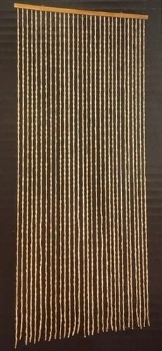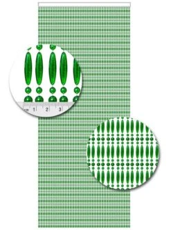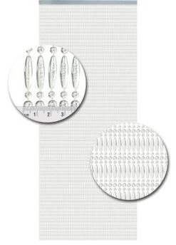 Dit zijn kwalitatief gezien echt goede kralengordijnen. De draadjes die gebruikt zijn, zijn gemaakt van nylon en dus extra sterk. De kunststof kralen zijn stuk voor stuk aan het nylon draad gesmolten. Het geheel hangt aan een witte cassette. Het is een vrij dicht kralengordijn waarbij er op circa elke centimeter een streng hangt. Om als voorbeeld even een vliegengordijn met een breedte van 90cm te noemen; hier hangen circa 90 strengen aan.