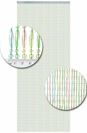 Luxe kralengordijn gemaakt van nylon draad. De kunststof kralen zijn stuk voor stuk aan het nylon draad gesmolten. Het geheel hangt aan een kunststof witte cassette.