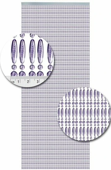 Luxe kralengordijn gemaakt van nylon draad. De kunststof kralen zijn stuk voor stuk aan het nylon draad gesmolten. Het geheel hangt aan een kunststof witte cassette.