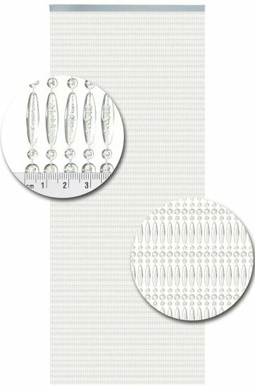 Luxe kralengordijn gemaakt van nylon draad. De kunststof kralen zijn stuk voor stuk aan het nylon draad gesmolten. Het geheel hangt aan een kunststof witte cassette.